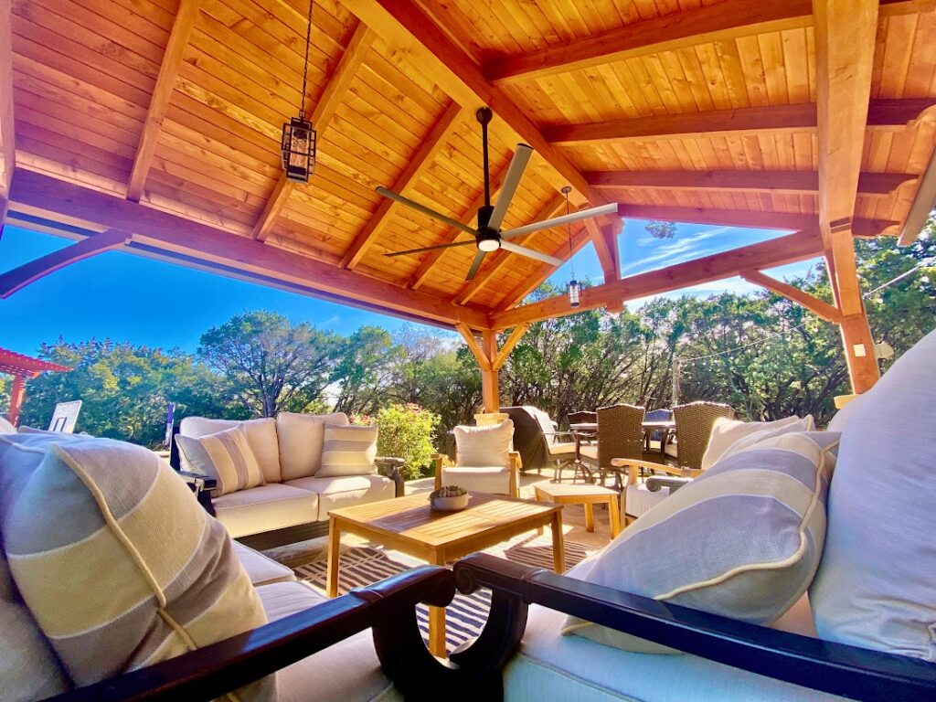 a pergola that provides dining under a canopy or vines, or a pavilion that